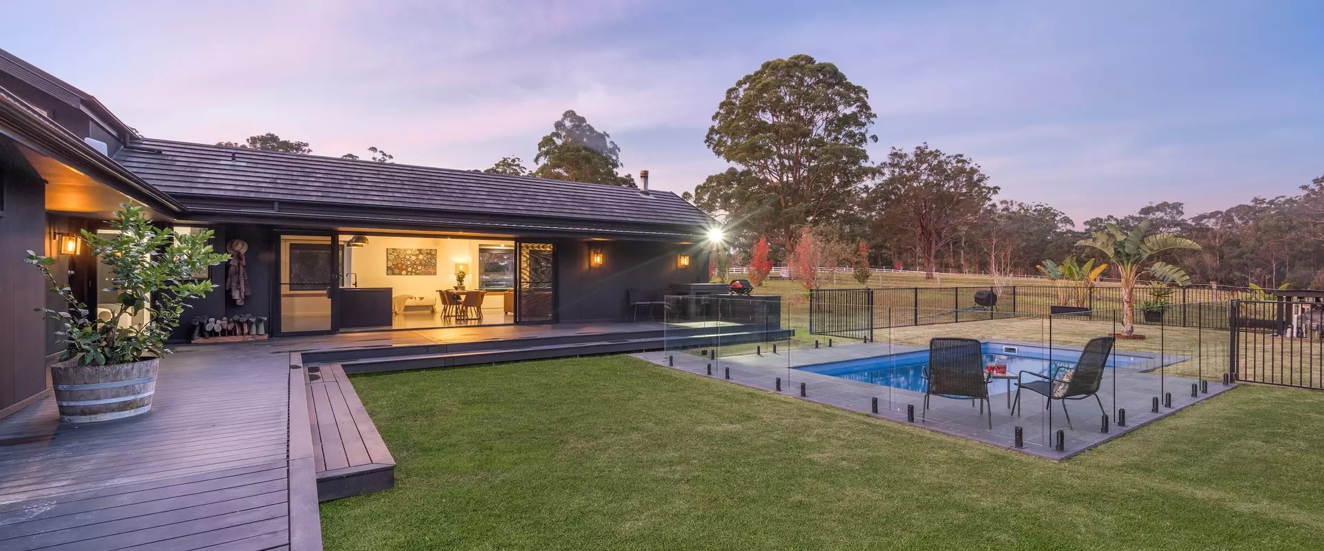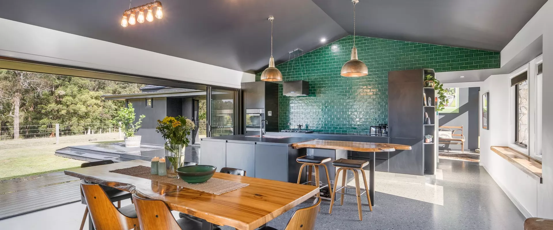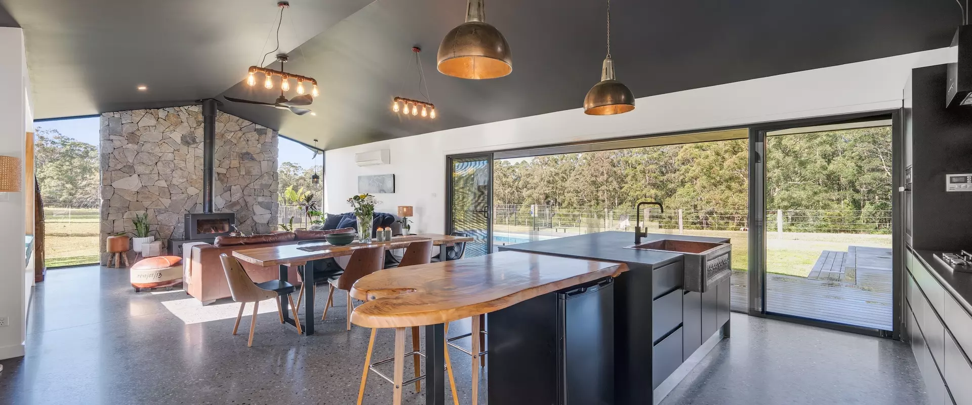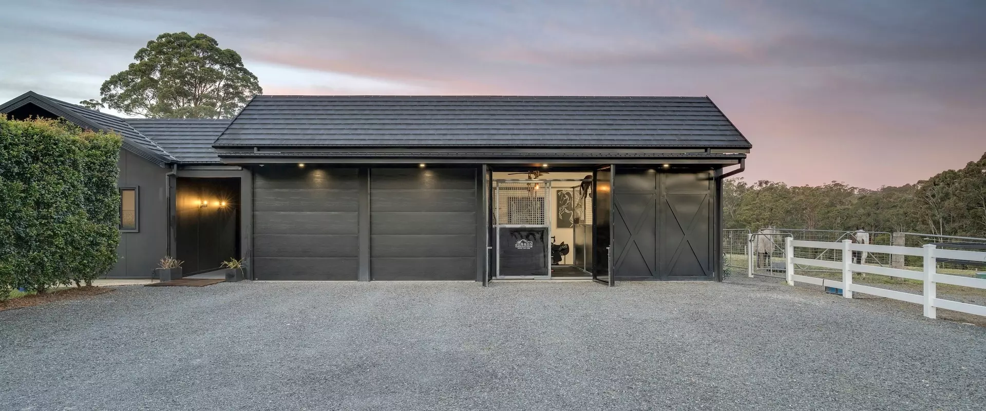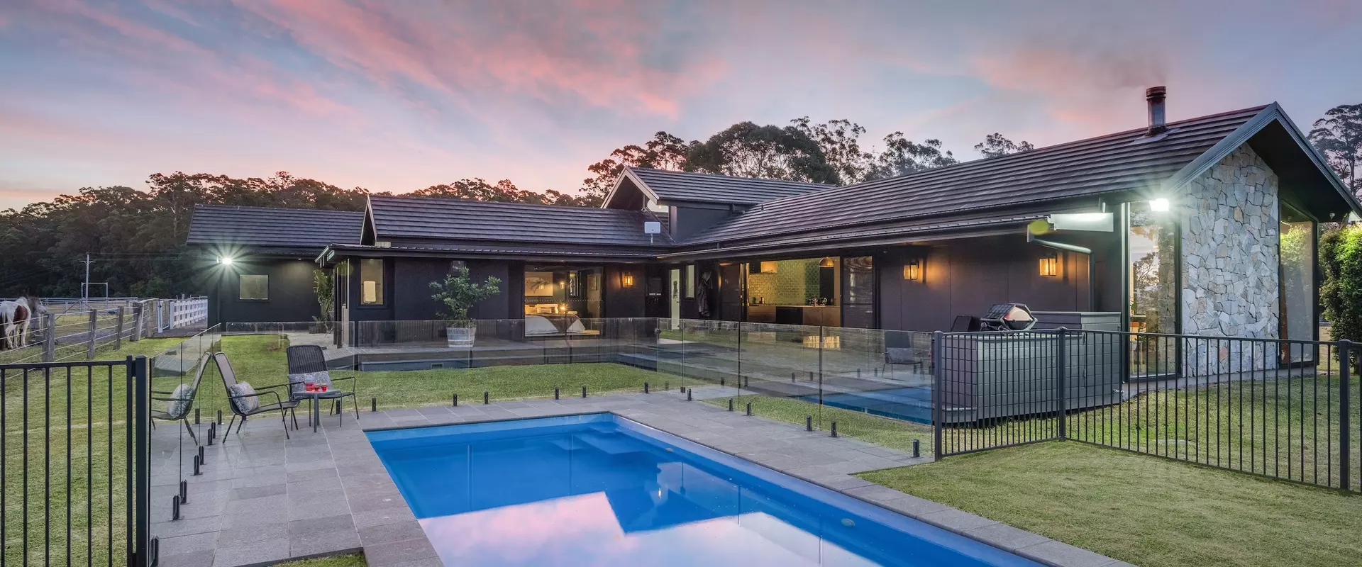Spanning 315m² of living space, the home is the embodiment of form meets function; generous proportions and natural materials are punctuated with bespoke touches throughout. Natural light floods the home through expansive glazing, framing uninterrupted rural vistas.