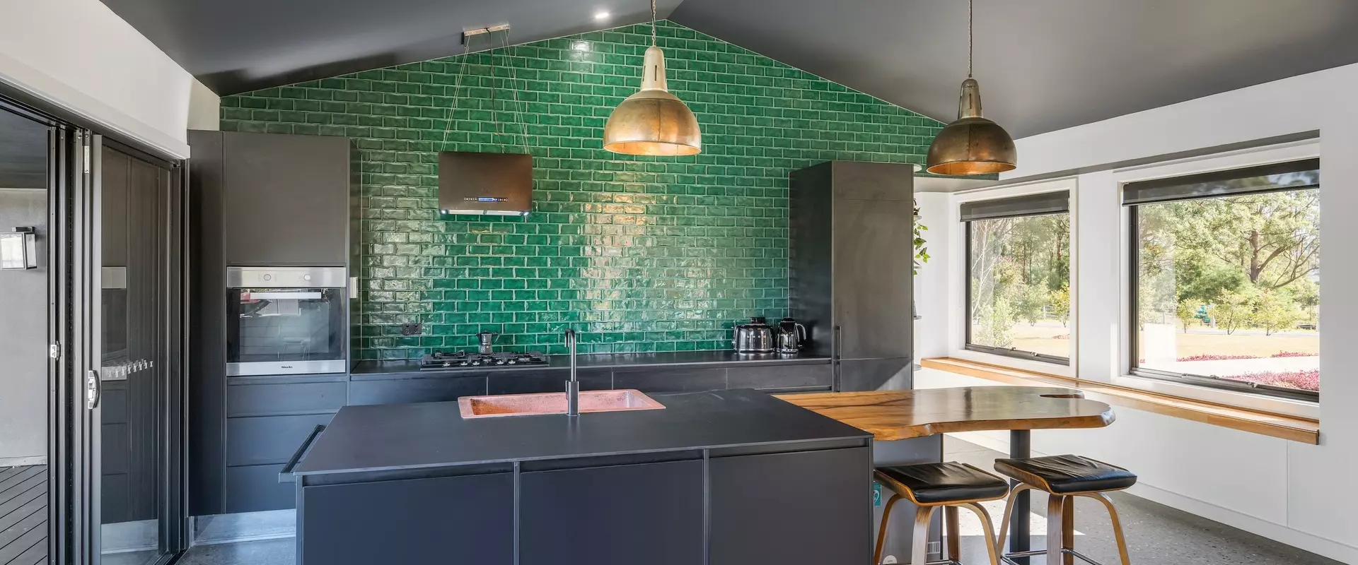 The north-facing residence makes a bold first impression, boasting distinctive copper cladding, as well as bluestone walls and columns; together with a soaring atrium and handmade copper/brass door commissioned from India.