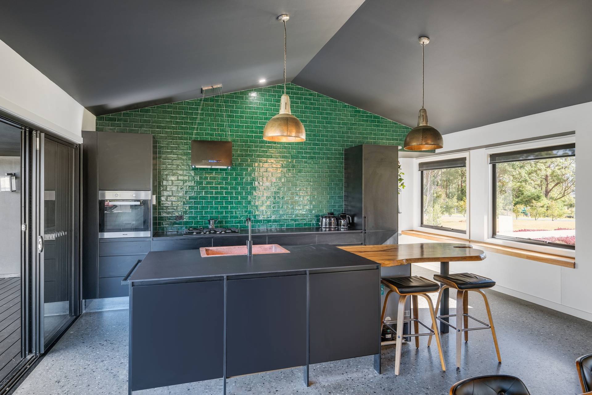 The north-facing residence makes a bold first impression, boasting distinctive copper cladding, as well as bluestone walls and columns; together with a soaring atrium and handmade copper/brass door commissioned from India.