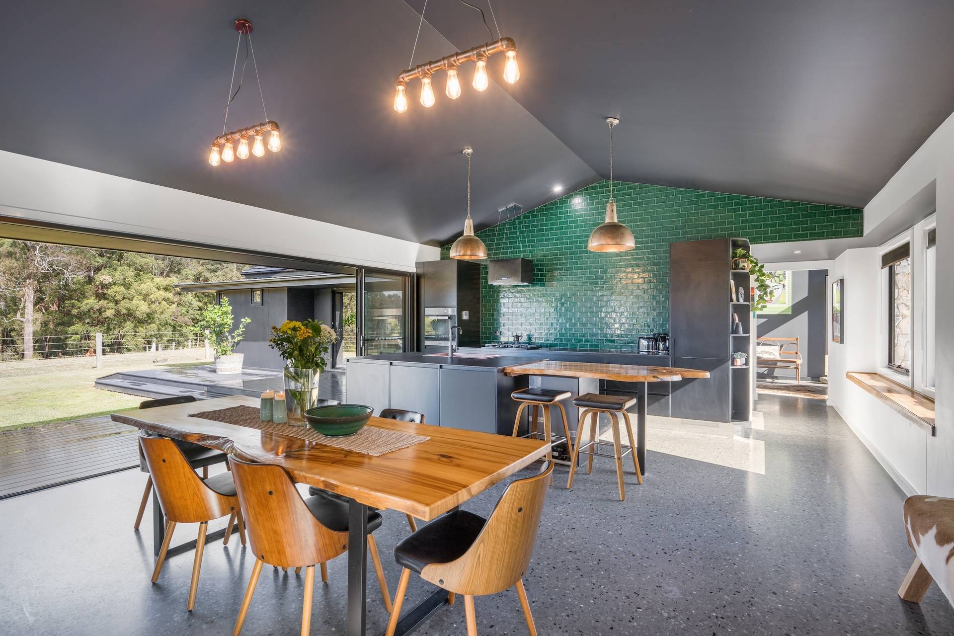 Spanning 315m² of living space, the home is the embodiment of form meets function; generous proportions and natural materials are punctuated with bespoke touches throughout. Natural light floods the home through expansive glazing, framing uninterrupted rural vistas.