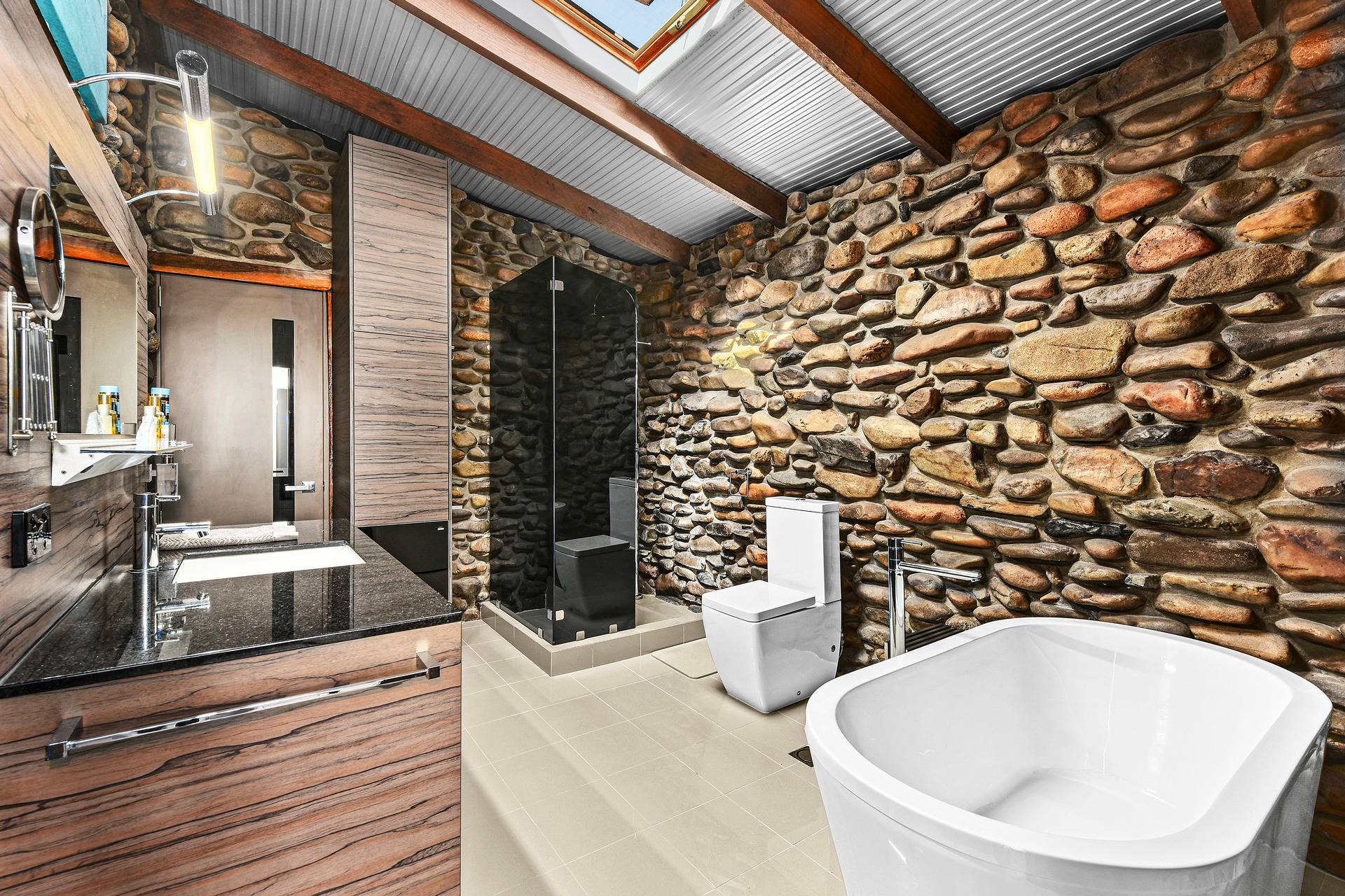 Featuring both natural and upcycled construction materials, the residence extolls the value of environmentally conscious design, offering character and style in abundance. The use of riverstone feature walls has informed the aesthetic throughout, its rich palette and textural elements conveying a calming, warm ambience.